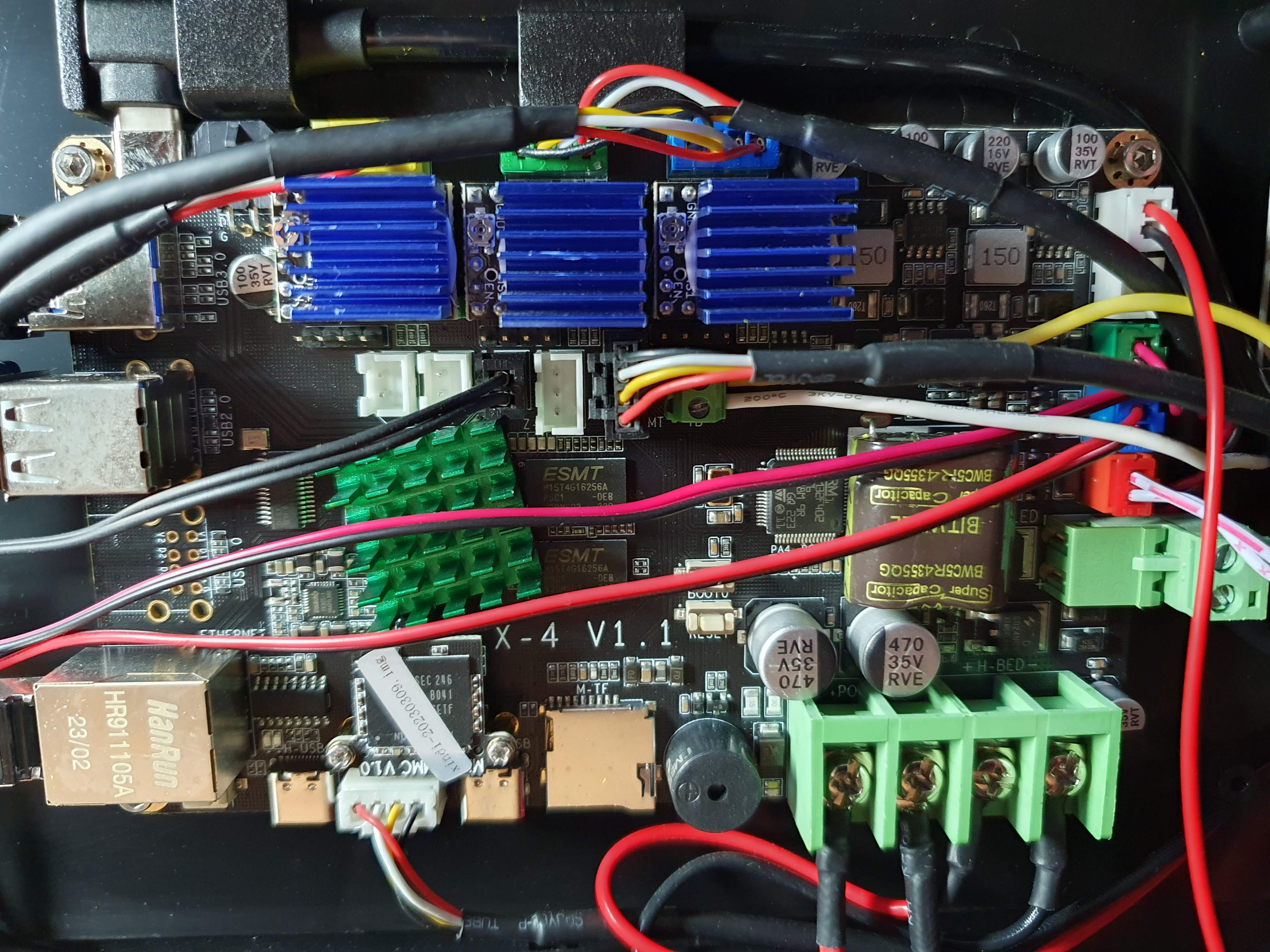 La electrónica modelo X-4 v1.1 parece diseñada por MKS para QIDI y monta un procesador Cortex-A53 de 64b a 1.5Mhz, 1GB DDR3 de RAM y 8GB de almacenamiento EMMC para el sistema operativo y archivos relacionados… con lo que no vamos a tener problemas en hacer funcionar el firmware de la impresora aunque puede quedarse limitada en el apartado almacenamiento, algo que QIDI ya ha tenido en cuenta y contamos con módulos EMMC de repuesto/ampliación. En cualquier caso contamos con puertos USB que podemos utilizar también.
